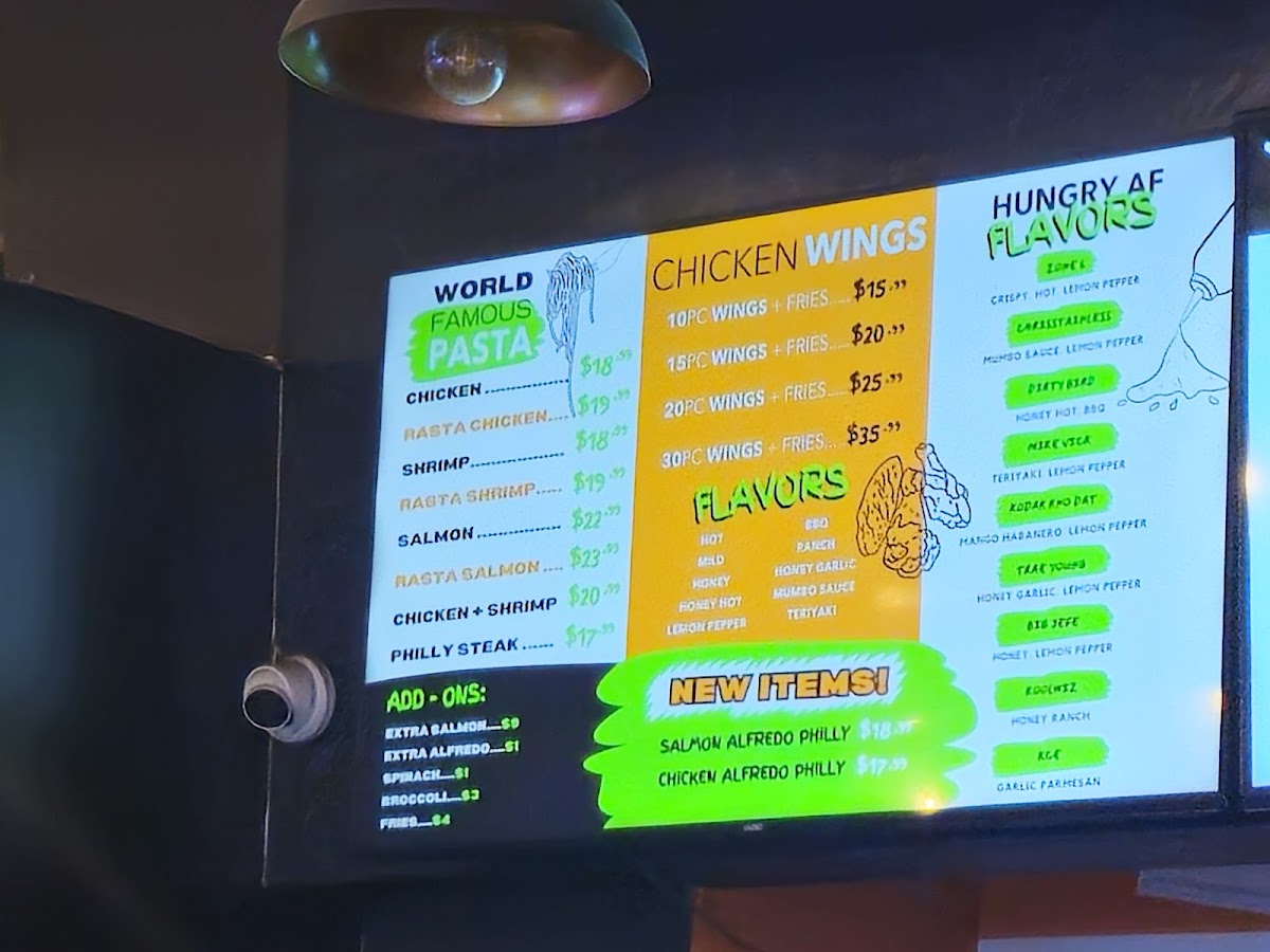 Our World Famous Pasta served with a Choice of Protein and Wings also comes with a Drink of your choice