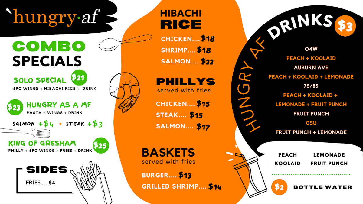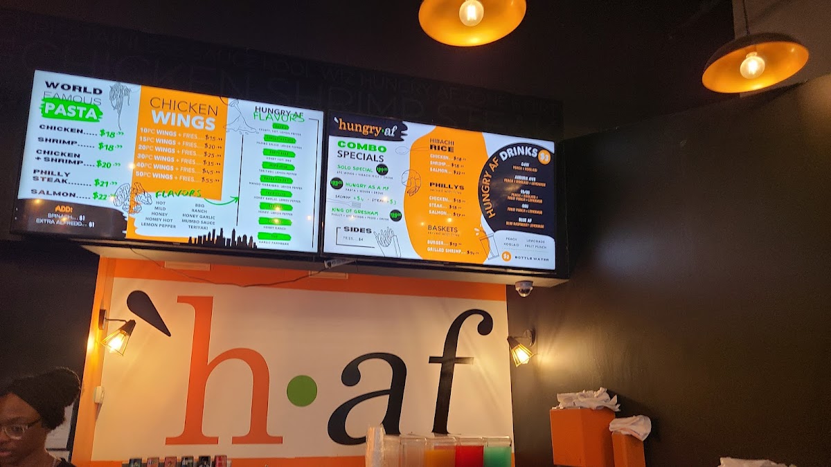 Hungry Smash Cheeseburger, 6 Wings, Fries, and Choice of Drink Burger comes with grilled onions, pickles, and HAF Sauce